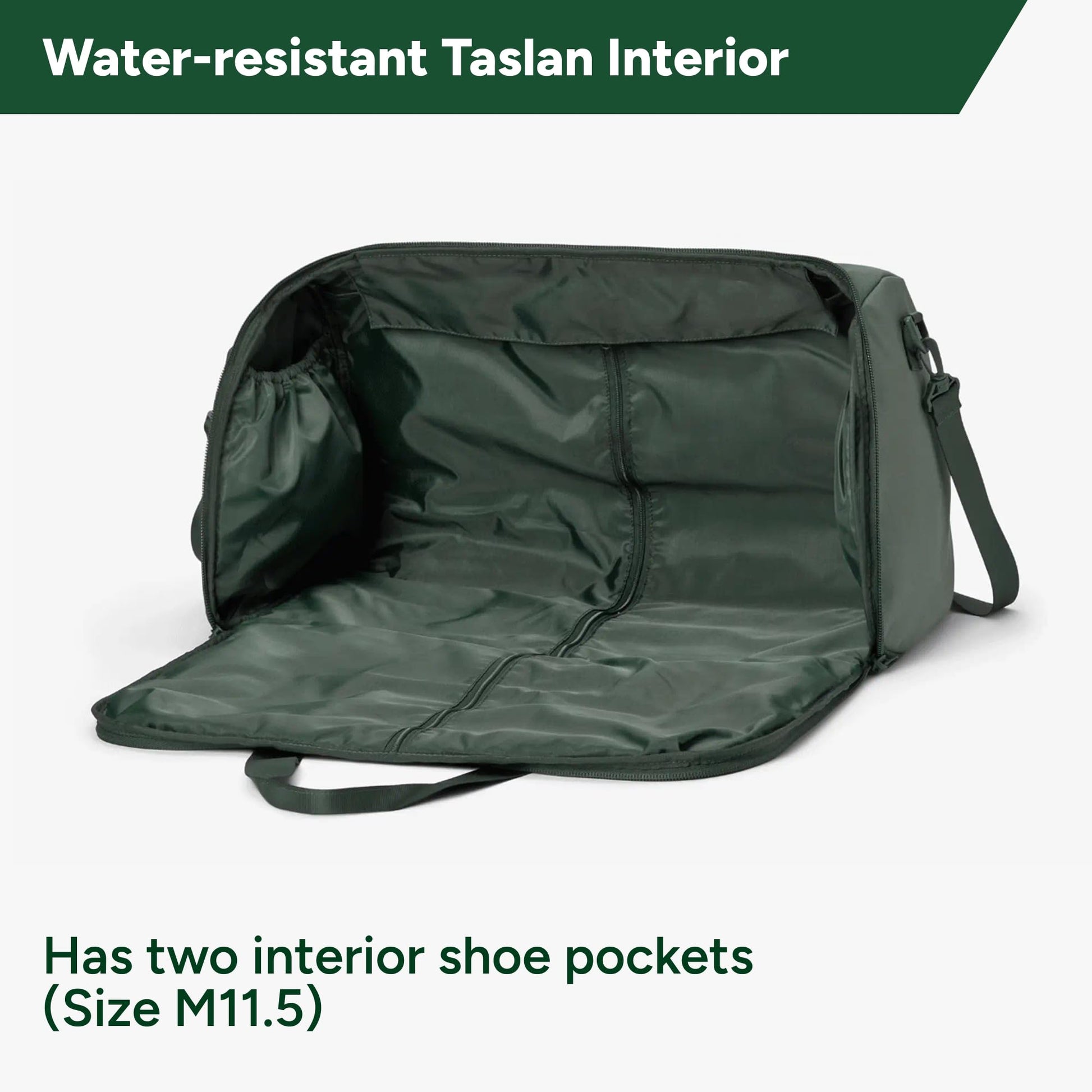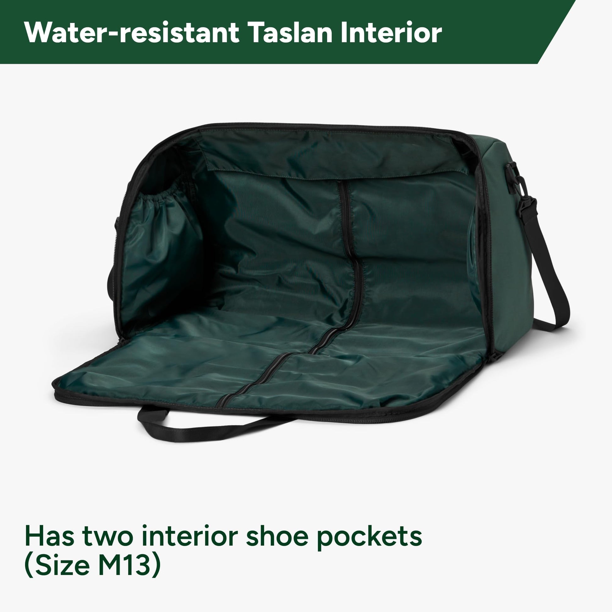 - PLENTY OF PACKING SPACE: Duffel holds 3+ days of clothes and has two interior shoe pockets (fits one size-13 shoe each)