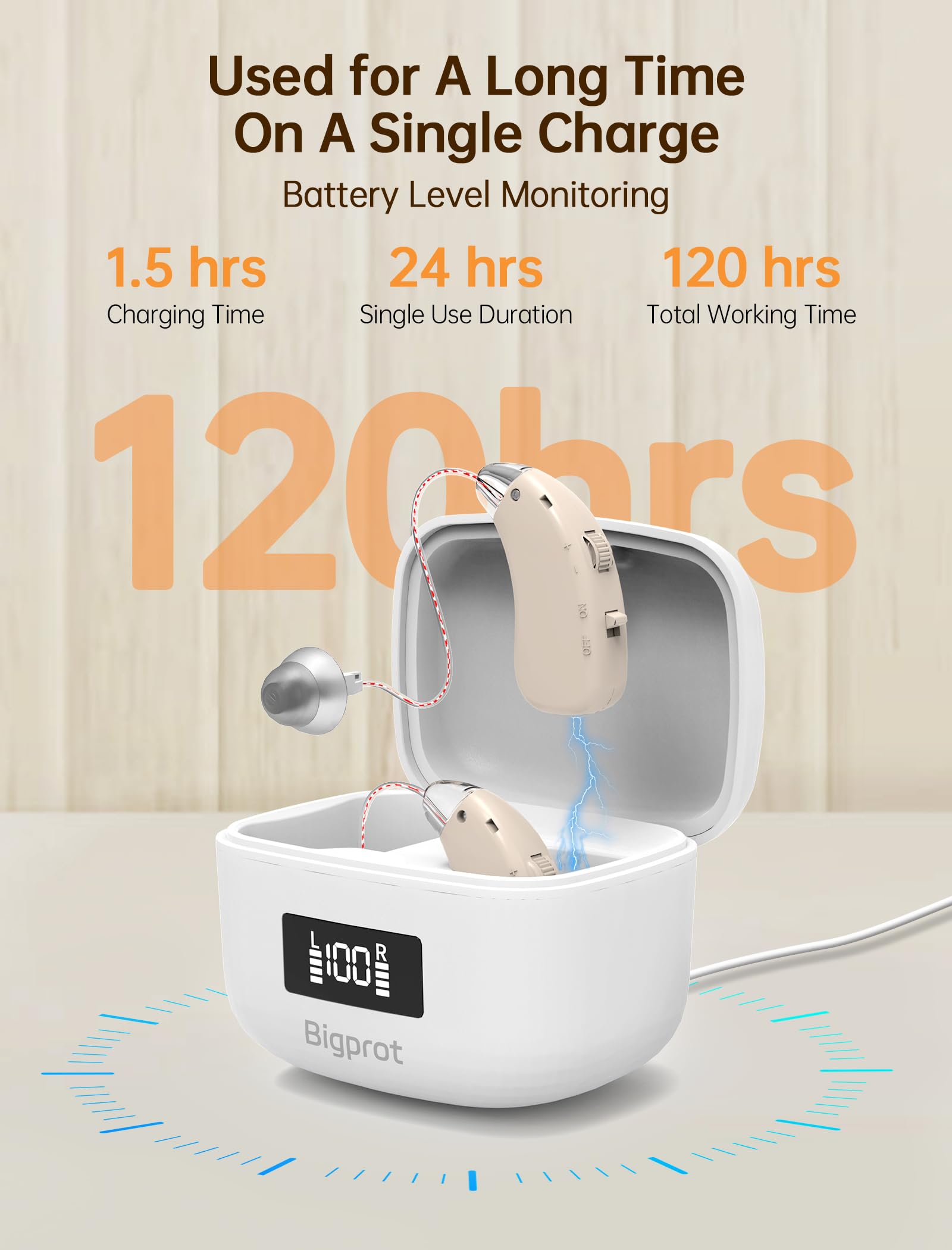 - Easy to Recharge: Charges fully in just 1.5 hours. Total up to 120hrs of hearing.The charging case features an LED display to check remaining power at a glance. With long battery life, you'll never worry about frequent charging.