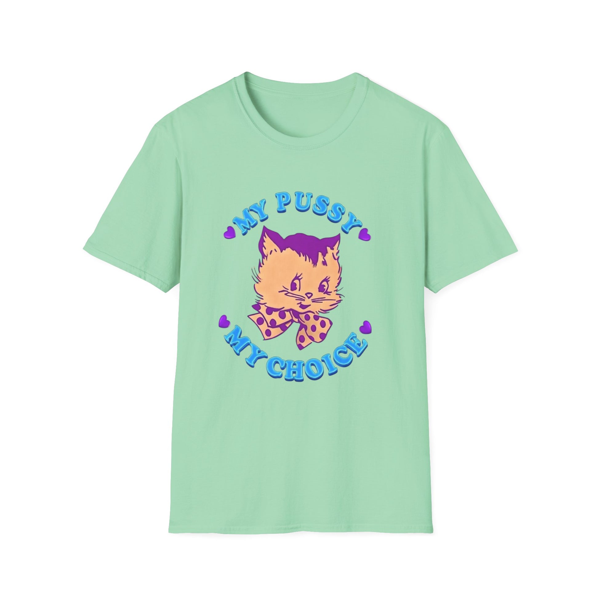 Theme/Features: Retro-cat graphic with bold pro-choice statement; soft, breathable ring-spun cotton; tubular knit and ribbed collar for durability